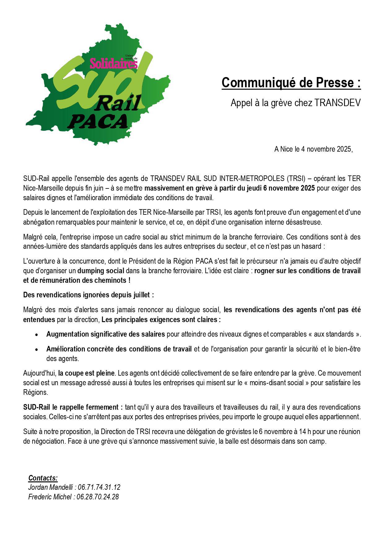 Grève de SUD-Rail à TRANSDEV TRSI sur PACA : Communiqué de presse