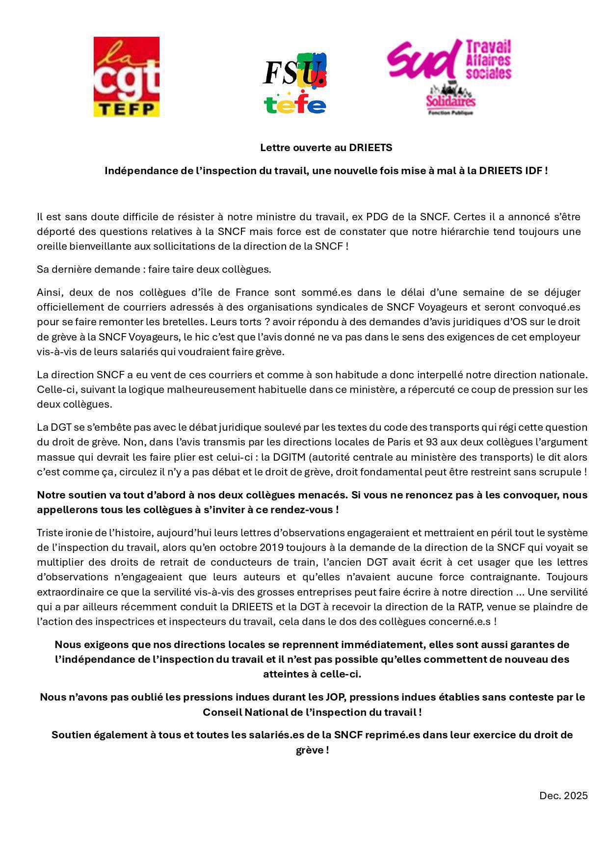 L'indépendance de l'Inspection du travail mise à mal à la DRIEETS IDF !