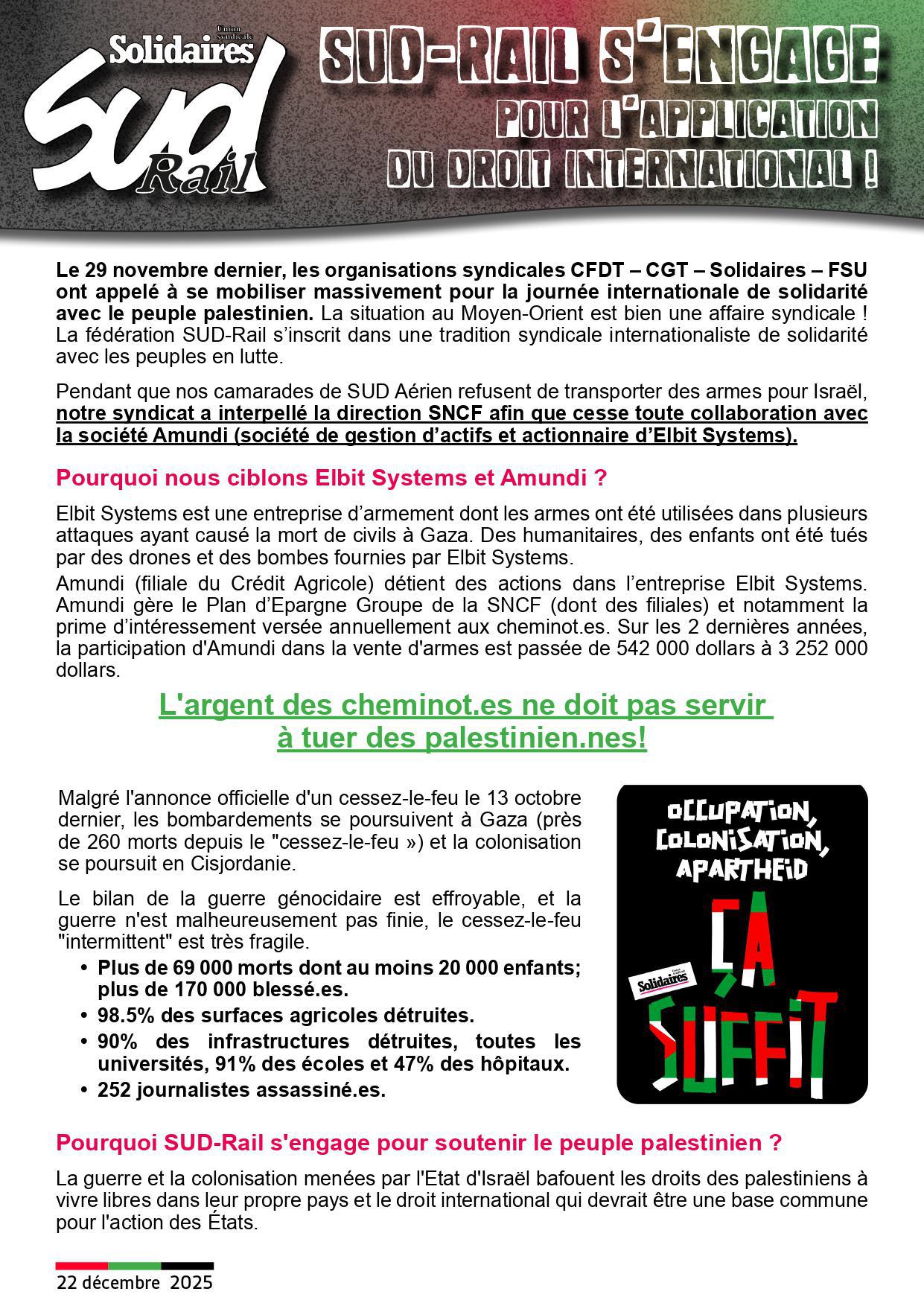 SUD-Rail // L'argent des cheminots ne doit pas servir à tuer des palestiniens !
