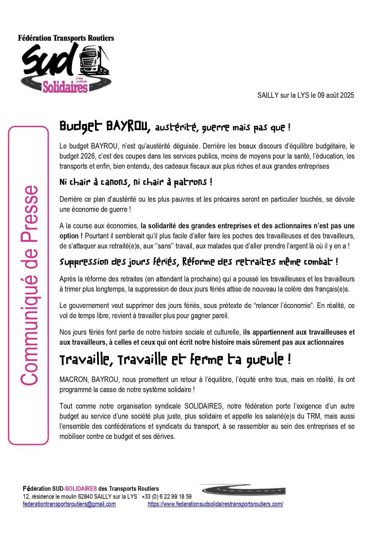 Fédération SUD Solidaires Transports Routiers // Budget Bayrou : Communiqué de presse
